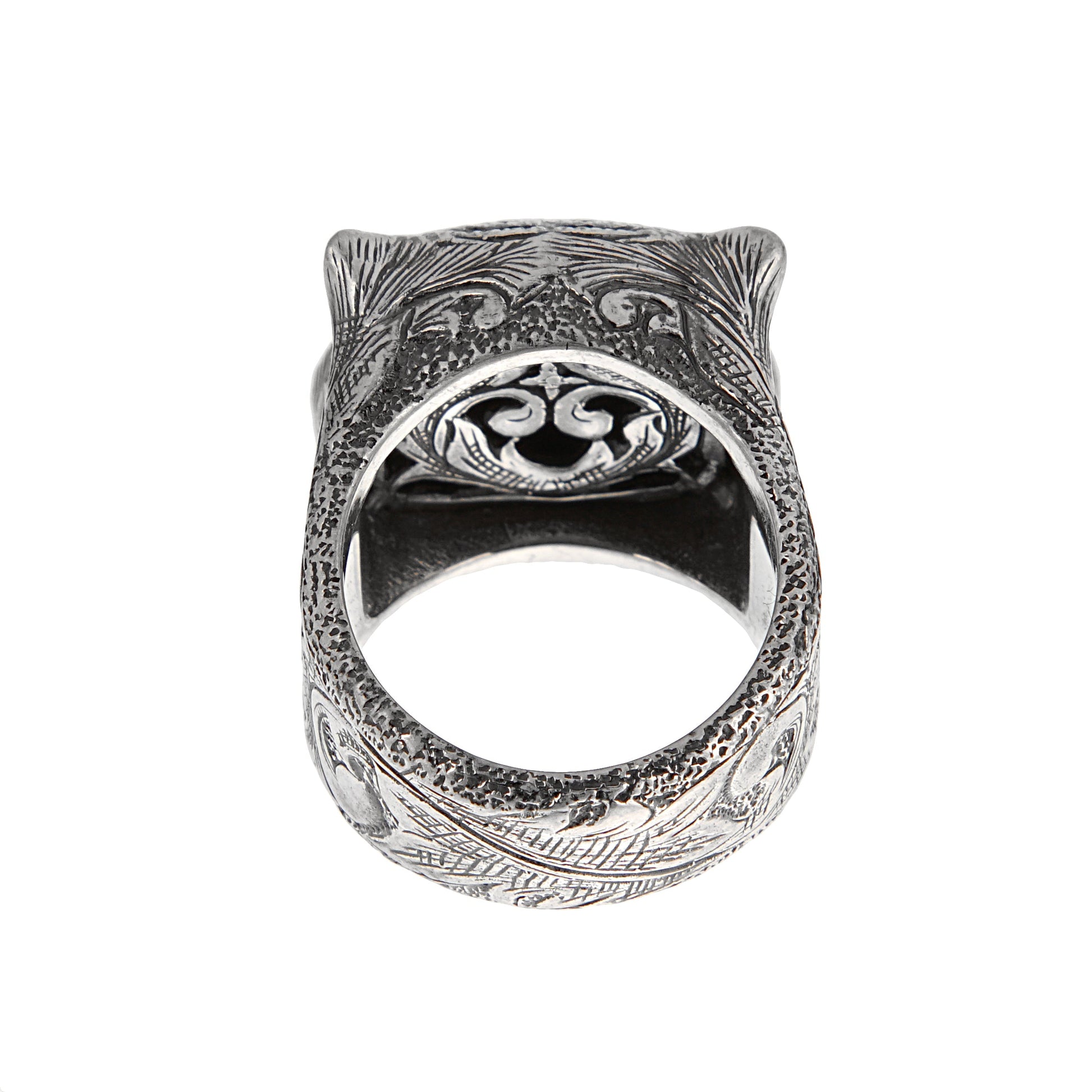 Make a fierce statement with this Gucci Garden Purple Zircon Sterling Silver Ring, size 5. This bold design from the Gucci Garden collection showcases a meticulously detailed tiger head, its expression fierce and majestic. Crafted in aged sterling silver, the band features intricate foliage-inspired engravings, evoking the spirit of the wild. The tiger’s eyes are set with vibrant purple zircon stones, adding a mesmerizing pop of color and mystique. Signature Gucci detailing—including the "Le Marché Des Merveilles" inscription inside the band and interlocking G symbols—reinforces the brand’s mythical and eclectic aesthetic. A standout accessory that embodies both strength and refinement, this ring is perfect for collectors of iconic statement jewelry.