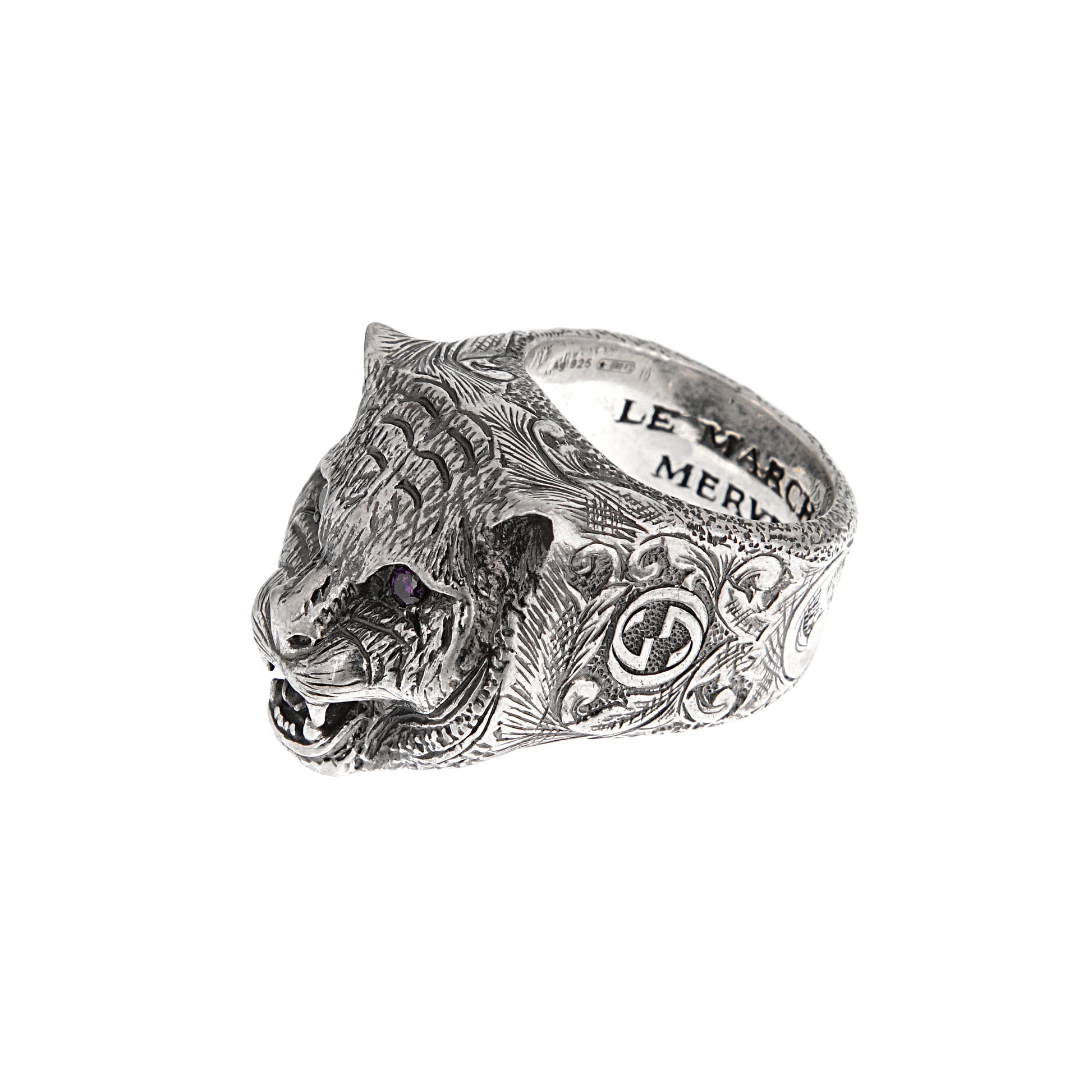 Unleash your wild side with this Gucci Le Marché des Merveilles Tiger Head Ring, a fierce and intricately detailed masterpiece of Italian craftsmanship. Made from aged sterling silver, this sculptural ring features a three-dimensional tiger head, complete with intensely textured fur, an expressive snarl, and striking violet-colored gemstone eyes that command attention.