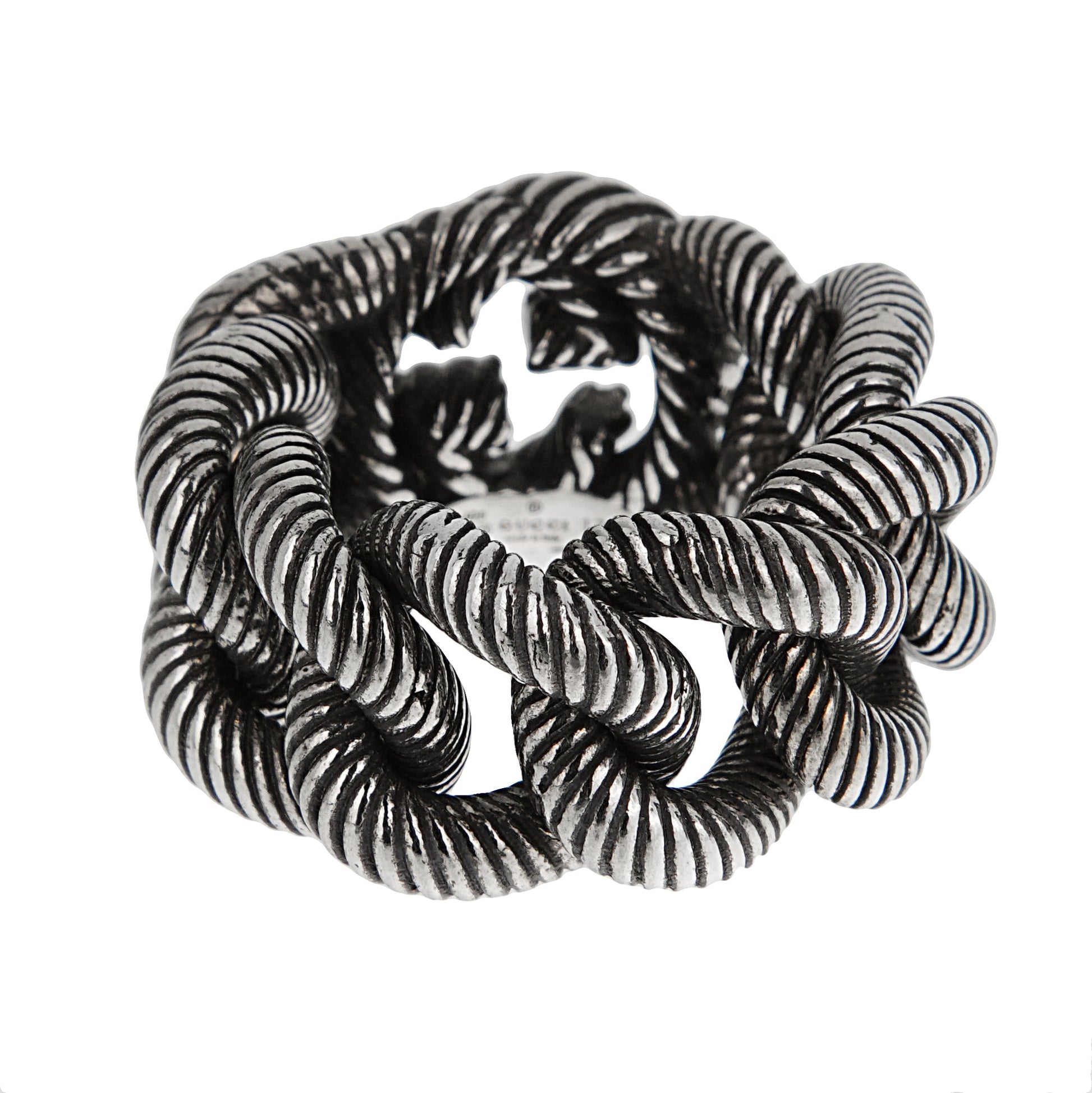 Boldly textured and unmistakably modern, this Gucci Sterling Silver Ring reimagines classic chain design with a sculptural twist. Crafted from aged 925 sterling silver, the ring is composed of interlocking twisted rope links that form a bold, dimensional silhouette with rich detailing throughout.