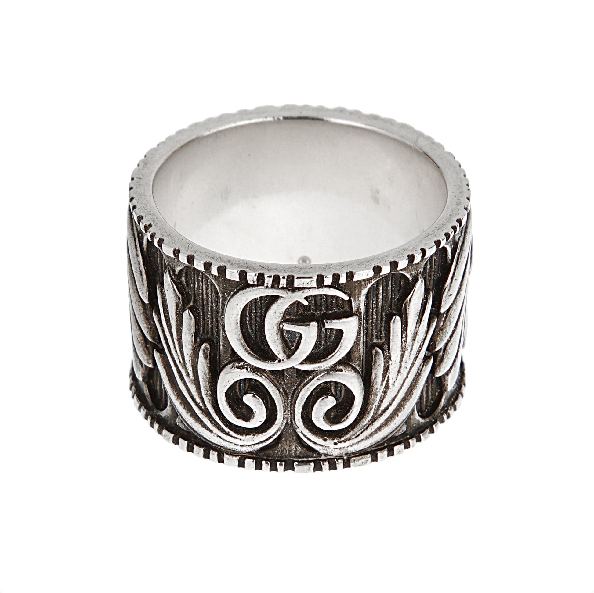 Sculptural and steeped in heritage, this Gucci Marmont Interlocking G Ring in sterling silver captures the bold, baroque spirit of the house's iconic aesthetic. Designed with a wide, comfort-fit band, the ring features an antique finish and intricate engraved scrollwork, flanked by botanical motifs that frame the raised Interlocking G logo at the center.