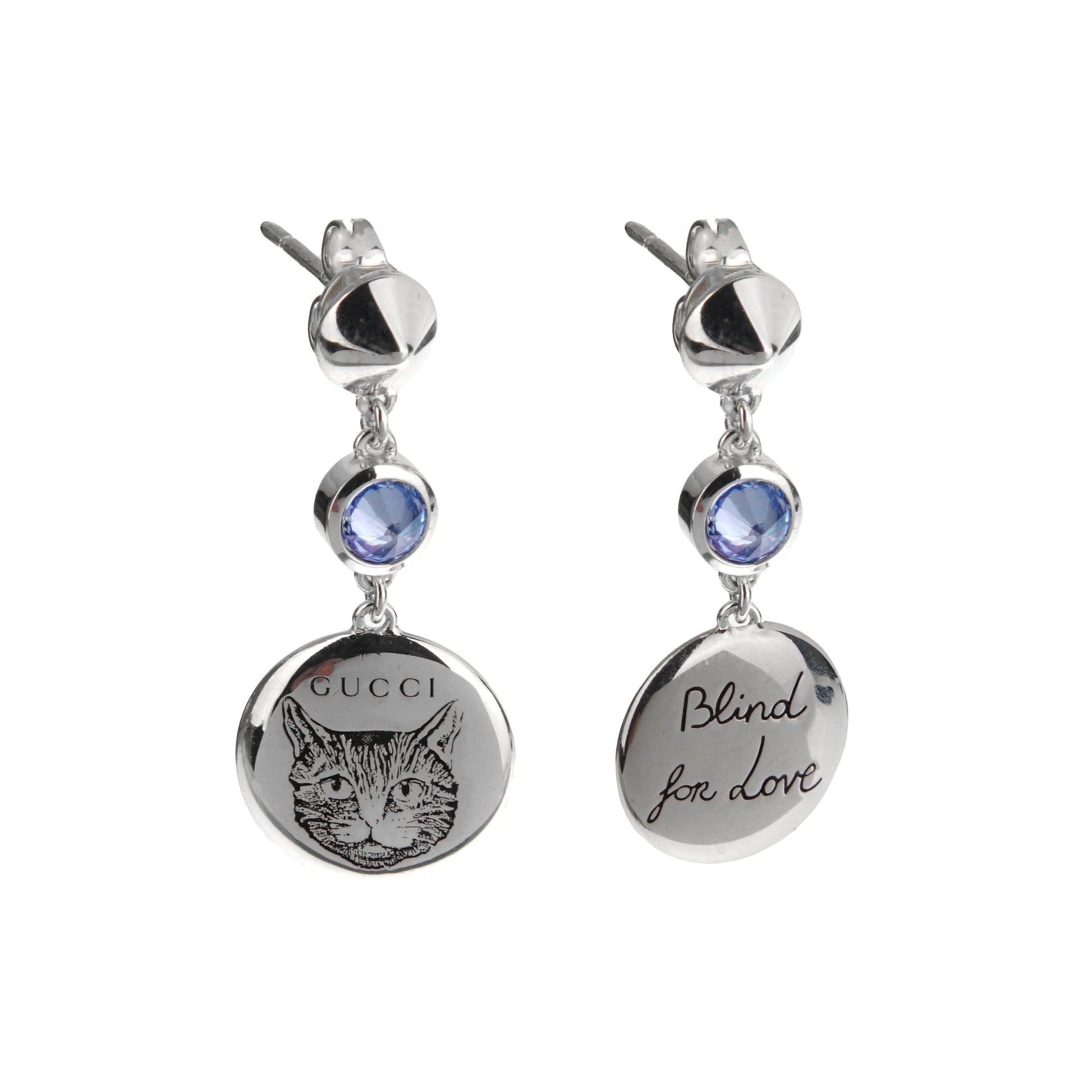 Playful and poetic, these Gucci round drop earrings blend symbolic motifs with a touch of color. Crafted from polished sterling silver, each earring features a bezel-set light blue zircons suspended beneath a stud and ending in a gleaming circular drop charm. One earring is engraved with Gucci's signature feline face, while the other reads the romantic phrase “Blind for Love.”