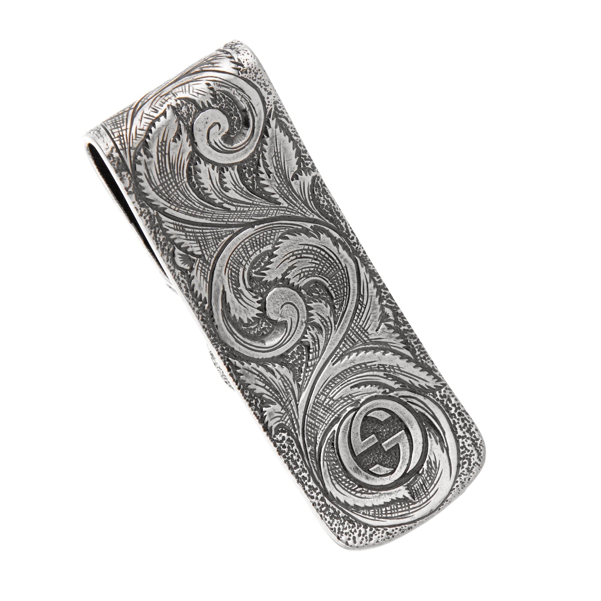 The body of the money clip is adorned with elaborate floral and scroll engraving, echoing Renaissance-inspired artistry and adding depth and texture to every curve. On the reverse, a dramatic flourish surrounds Gucci’s iconic interlocking GG emblem, grounding the piece in the brand’s heritage of bold Italian design.