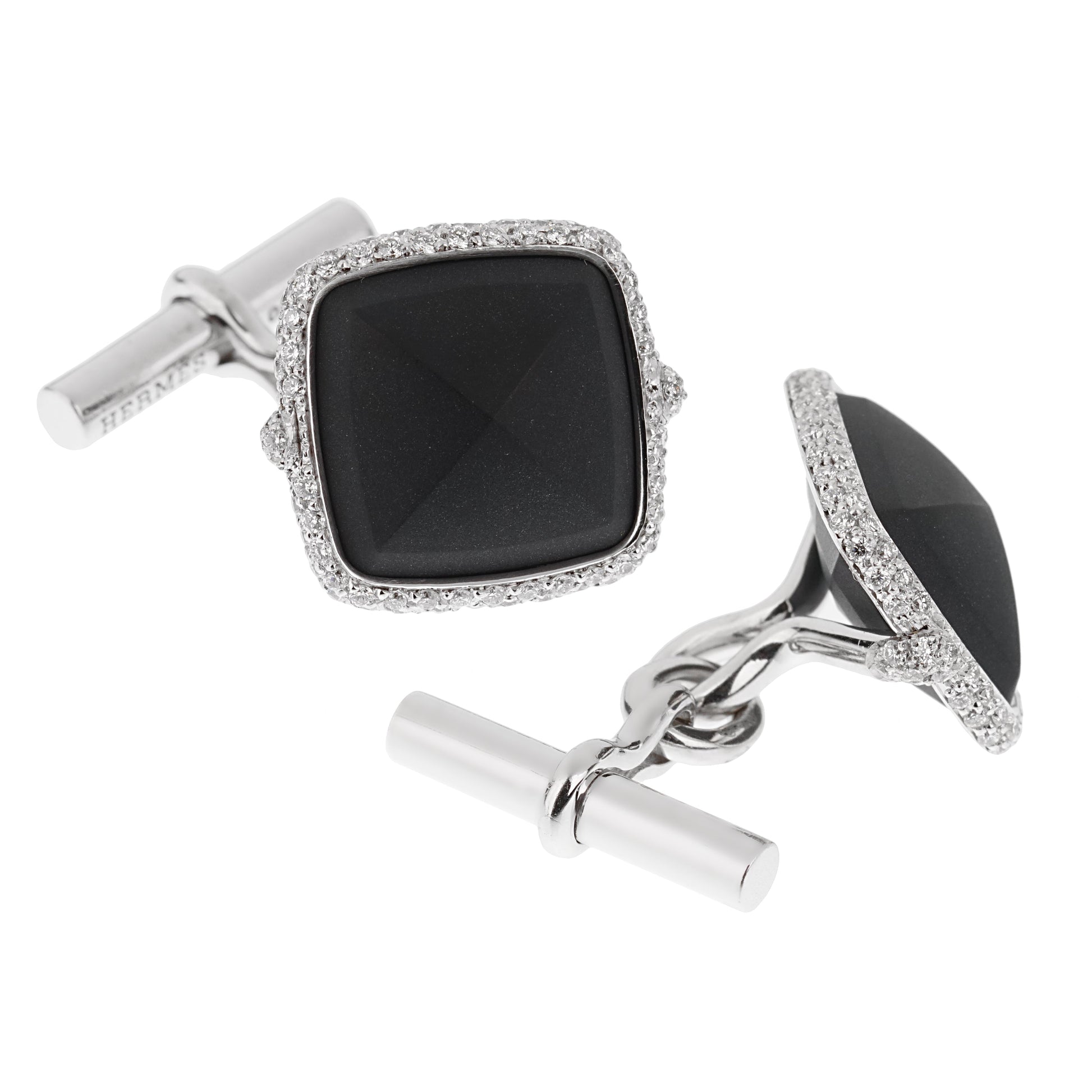 At the heart of each cufflink lies a meticulously crafted pyramid-shaped onyx, a striking black gemstone revered for its deep, lustrous hue and association with strength and stability. The onyx, carefully selected by Hermes' master artisans, adds a touch of mystery and intrigue to the design, creating a captivating contrast against the cool, silvery elegance of the white gold setting.
