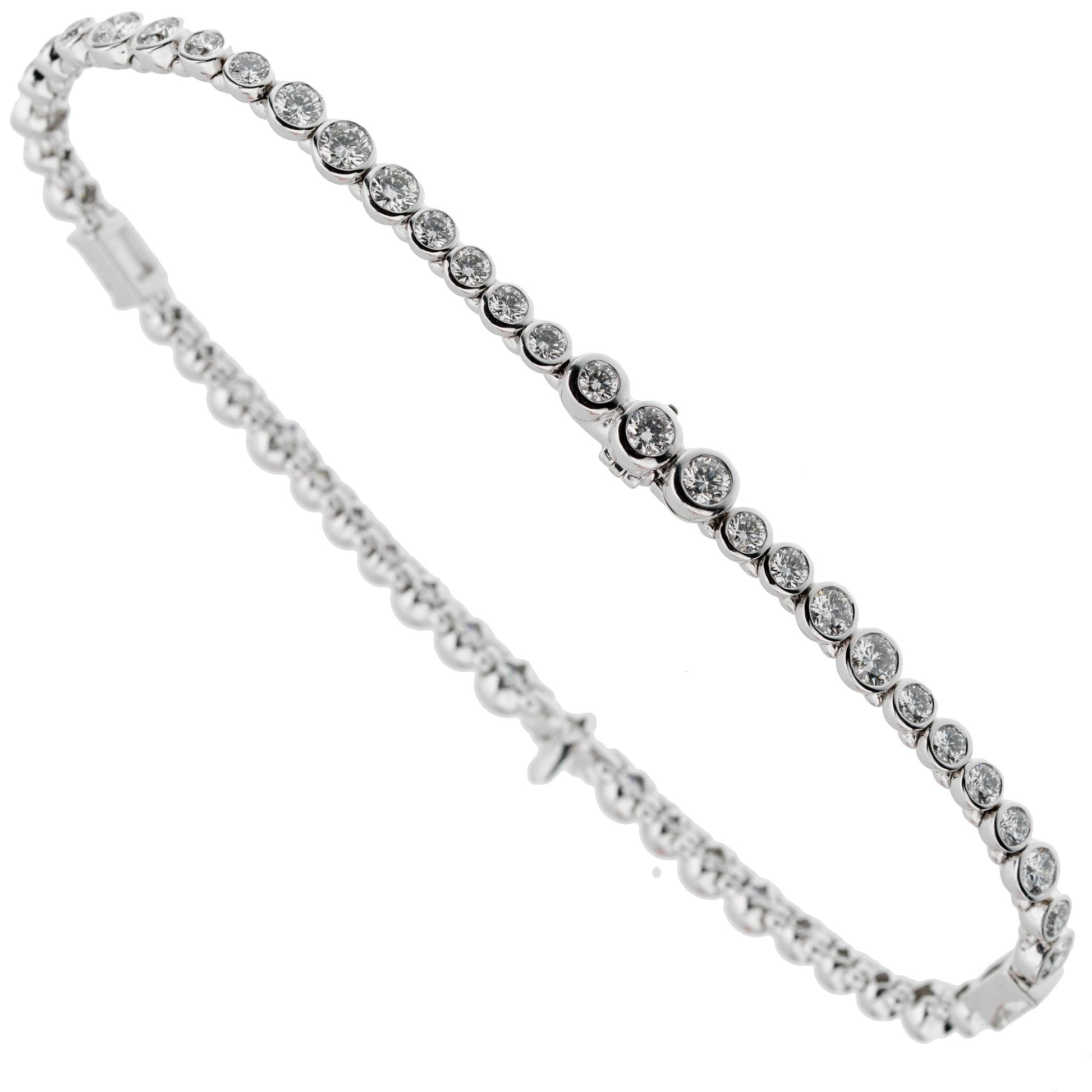 The piece features an array of perfectly matched, round brilliant cut diamonds that glitter with exceptional brilliance. Each diamond is meticulously set within a delicate bezel setting, emphasizing its radiant sparkle and creating a continuous circle of light around your wrist.