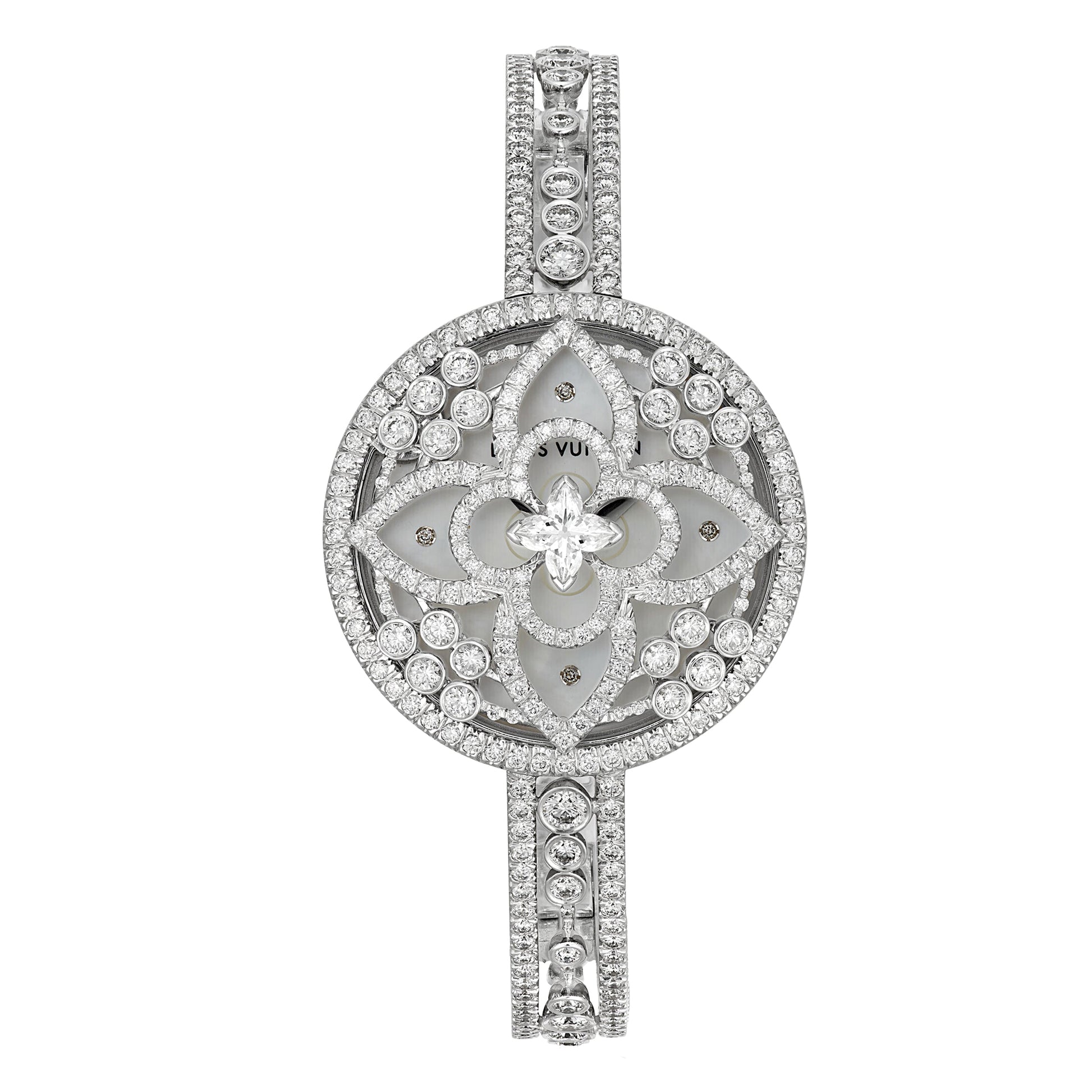 Introducing the extraordinary Louis Vuitton Les Ardentes Secret Diamond Watch, an exquisite masterpiece that exudes opulence and sophistication. This unmistakable timepiece showcases a plethora of round brilliant cut diamonds, with a stunning total of 485 diamonds adorning its intricate design. At the center, a flower-shaped diamond takes center stage, crafted with a special and intricate design that reveals additional brilliance through its numerous facets.