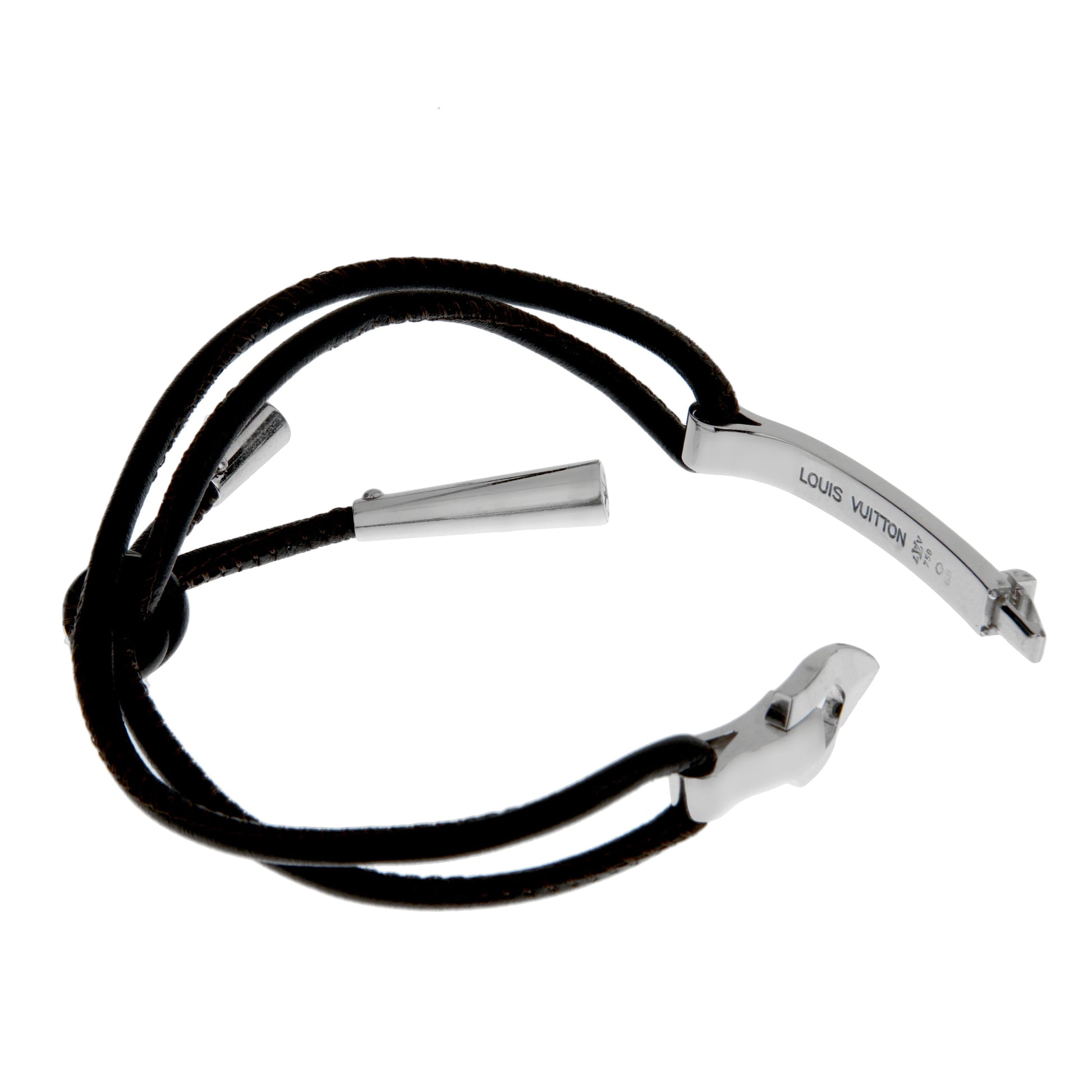 Discover timeless elegance and cutting-edge style with the Louis Vuitton White Gold Bangle Leather Bracelet. This luxurious piece artfully combines a sleek white gold bangle with a fine leather cord, encapsulating the brand's commitment to craftsmanship, innovation, and distinctive design.