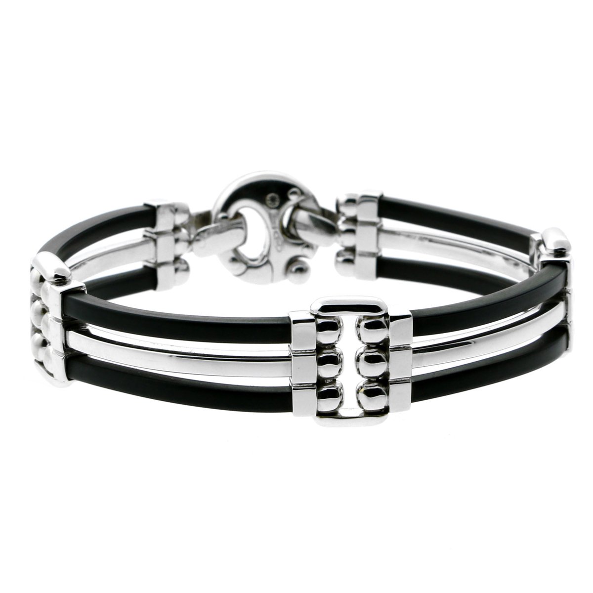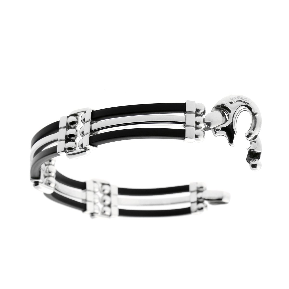 The perfect accent to anything from a crisp black tuxedo to a semi-casual yachting outfit of fitted trousers and boat shoes, this 18k white gold men's bracelet from Baraka is a textbook definition of "versatility". Its alternating rubber/white gold band provides not only strength, but a subtle touch of aesthetic charm as well.