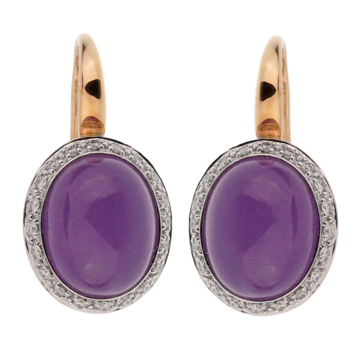 A stunning set of Mimi Milano drop earrings showcasing 8.20ct of Violet Jade encased with .20ct of round brilliant cut diamonds in 18k gold.
