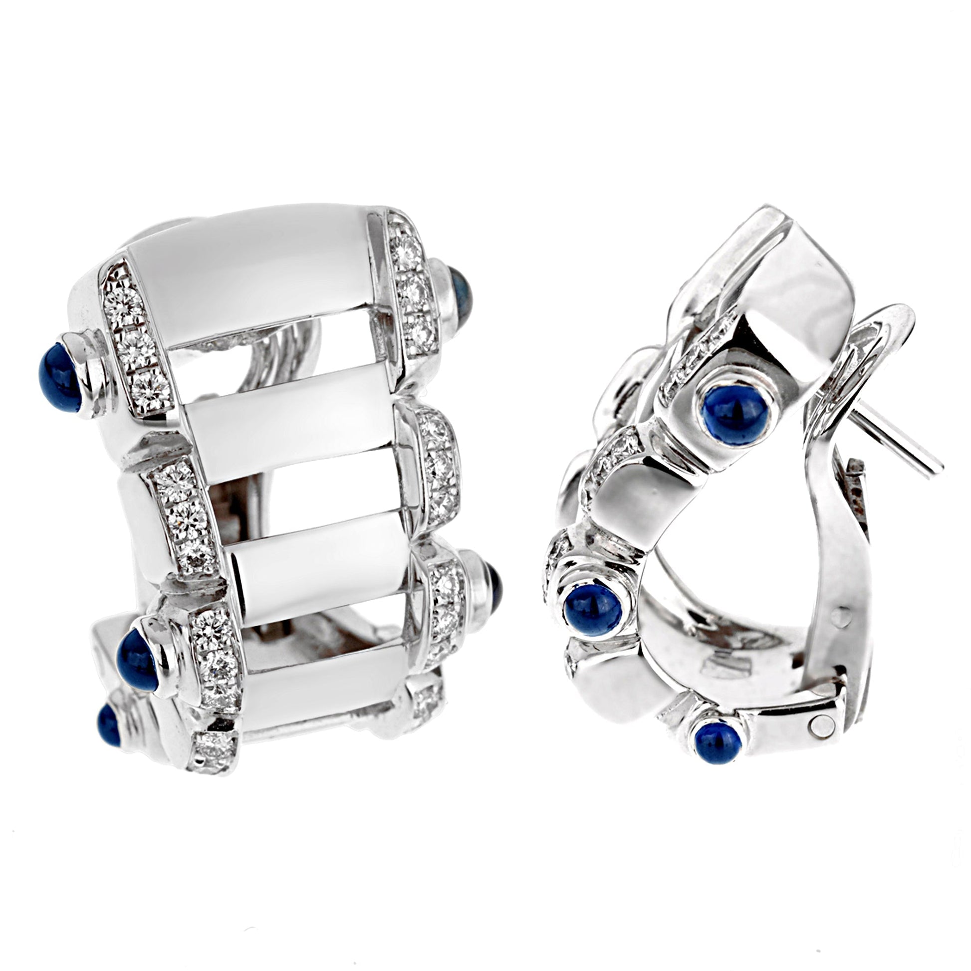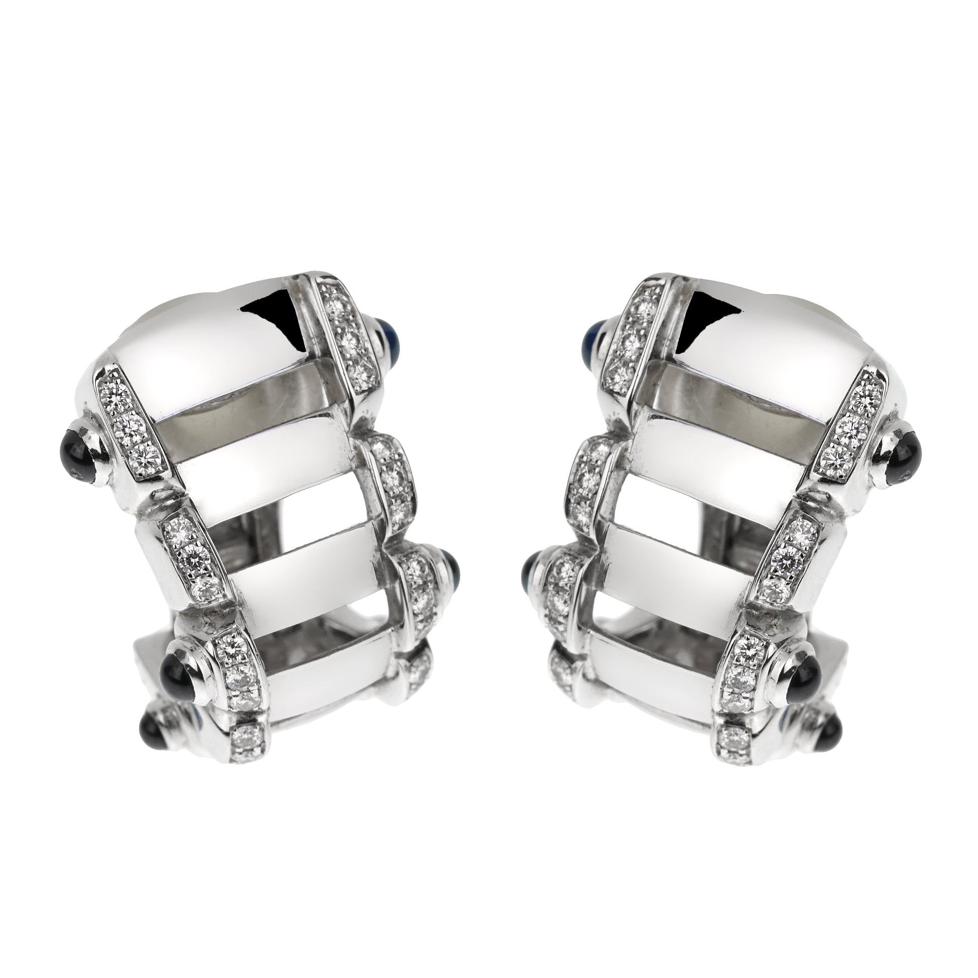 Complementing the brilliance of the diamonds are cabochon-cut sapphires. These deep blue sapphires are strategically placed at the ends of each link, adding a pop of color and an element of regal sophistication. The combination of white gold, diamonds, and sapphires creates a harmonious balance of luxury and elegance, making these earrings a true statement piece.