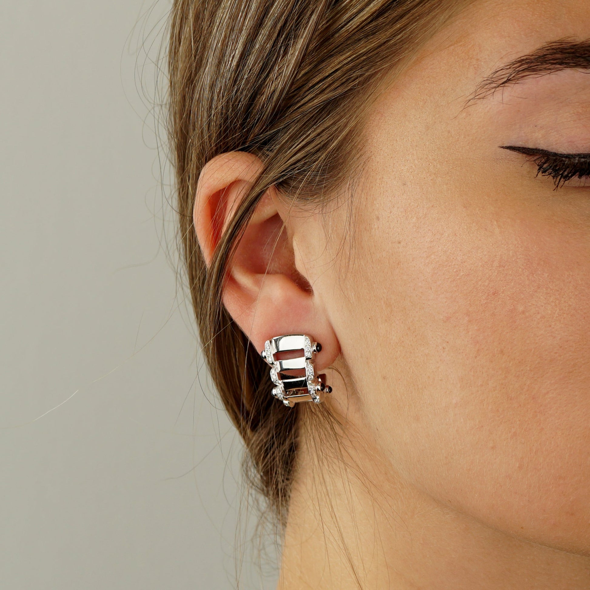 The earrings feature a unique and captivating design that is both modern and classic, making them a versatile addition to any jewelry collection. The structure of the earrings is composed of interconnected links, reminiscent of the iconic bracelet design of the Patek Philippe Twenty-4 watch collection. This design element not only adds a touch of sophistication but also ensures that the earrings catch and reflect light from every angle, creating a dazzling effect.