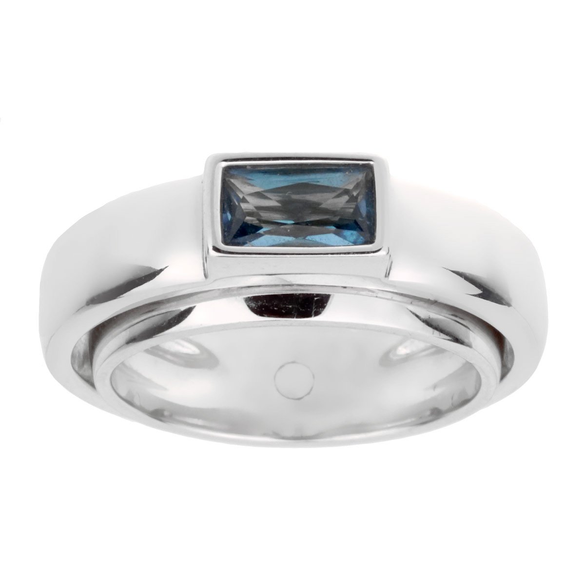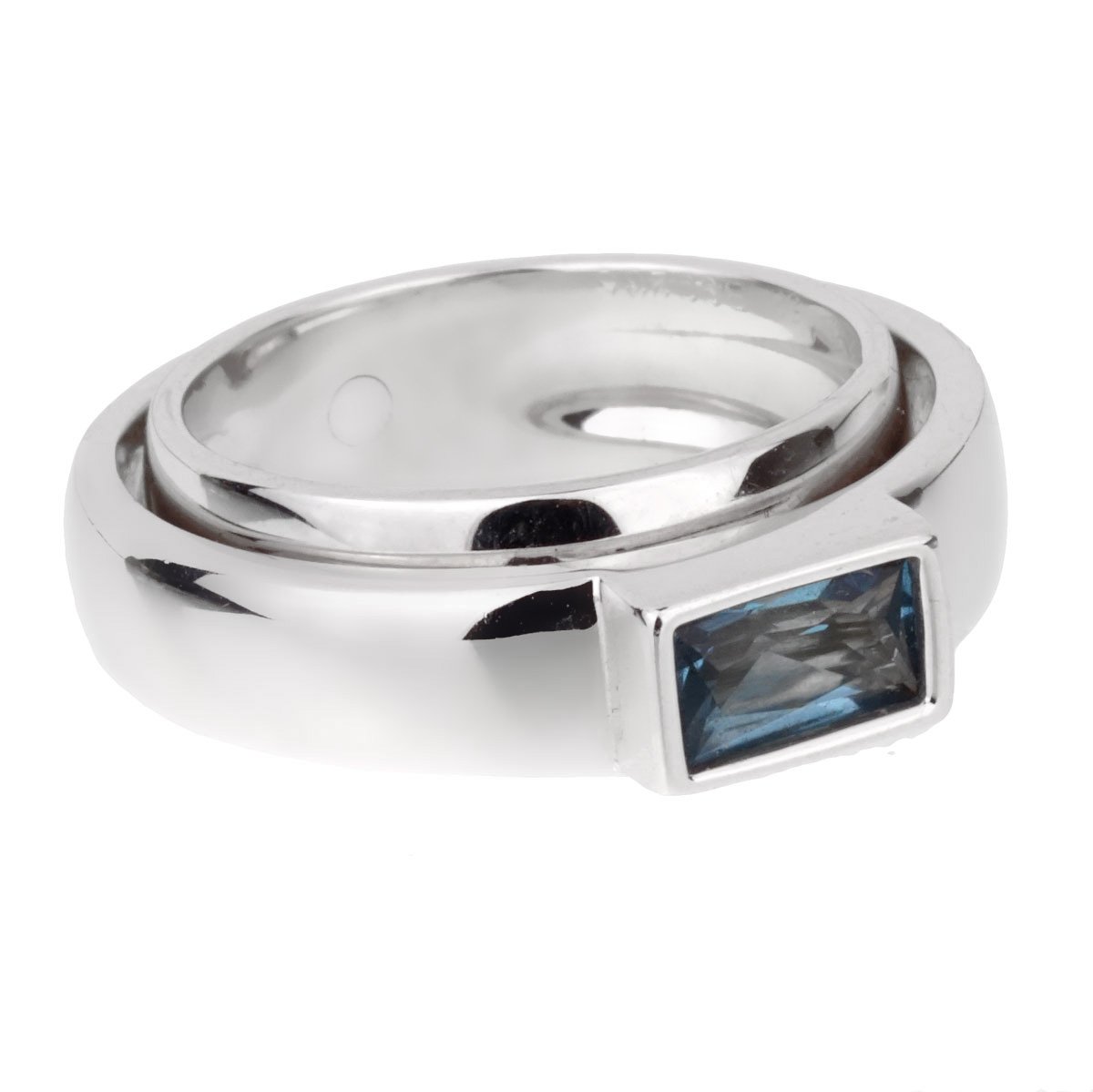 A chic Piaget Possession cocktail ring set with a rectangular modified brilliant blue topaz center stone and swivel shank in 18k white gold. The ring measures a size 6 1/4