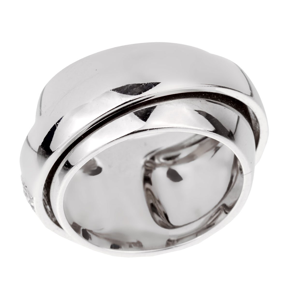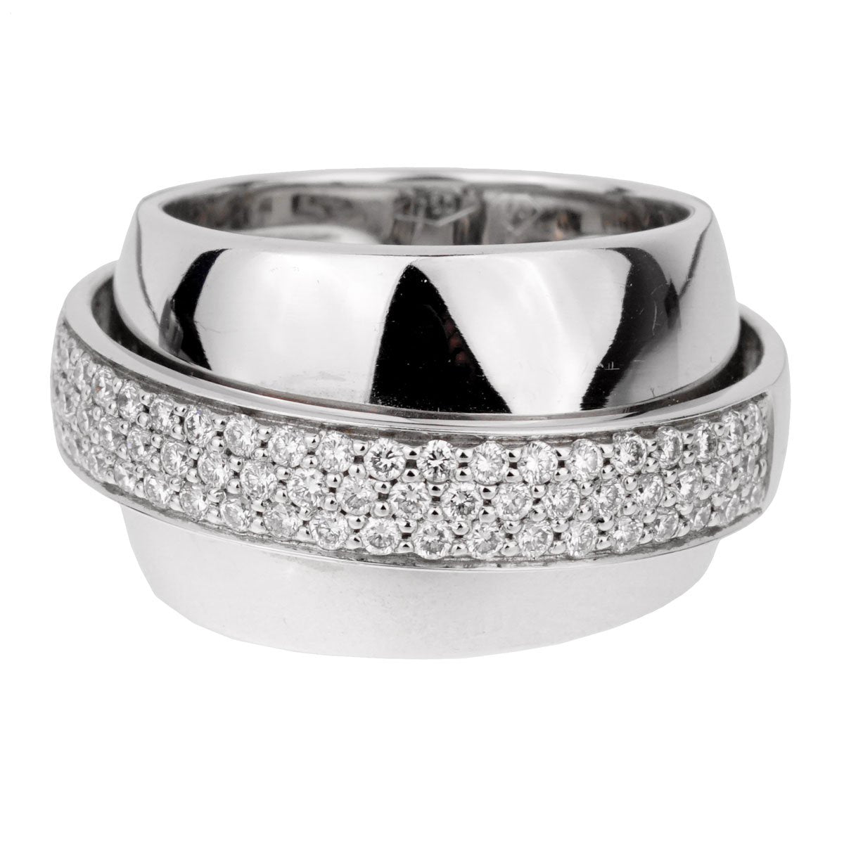 The Piaget Possession Pave Diamond Ring in 18k white gold size 5 3/4 is a bold and radiant creation that captures the essence of modern luxury. Weighing approximately 14 grams, the ring has a substantial presence on the hand while maintaining comfort and balance. Its design is defined by three rows of meticulously set round brilliant cut diamonds that wrap the band in an endless stream of sparkle. The pave setting allows the stones to sit closely together, creating a seamless surface of light that glimmers with every movement.