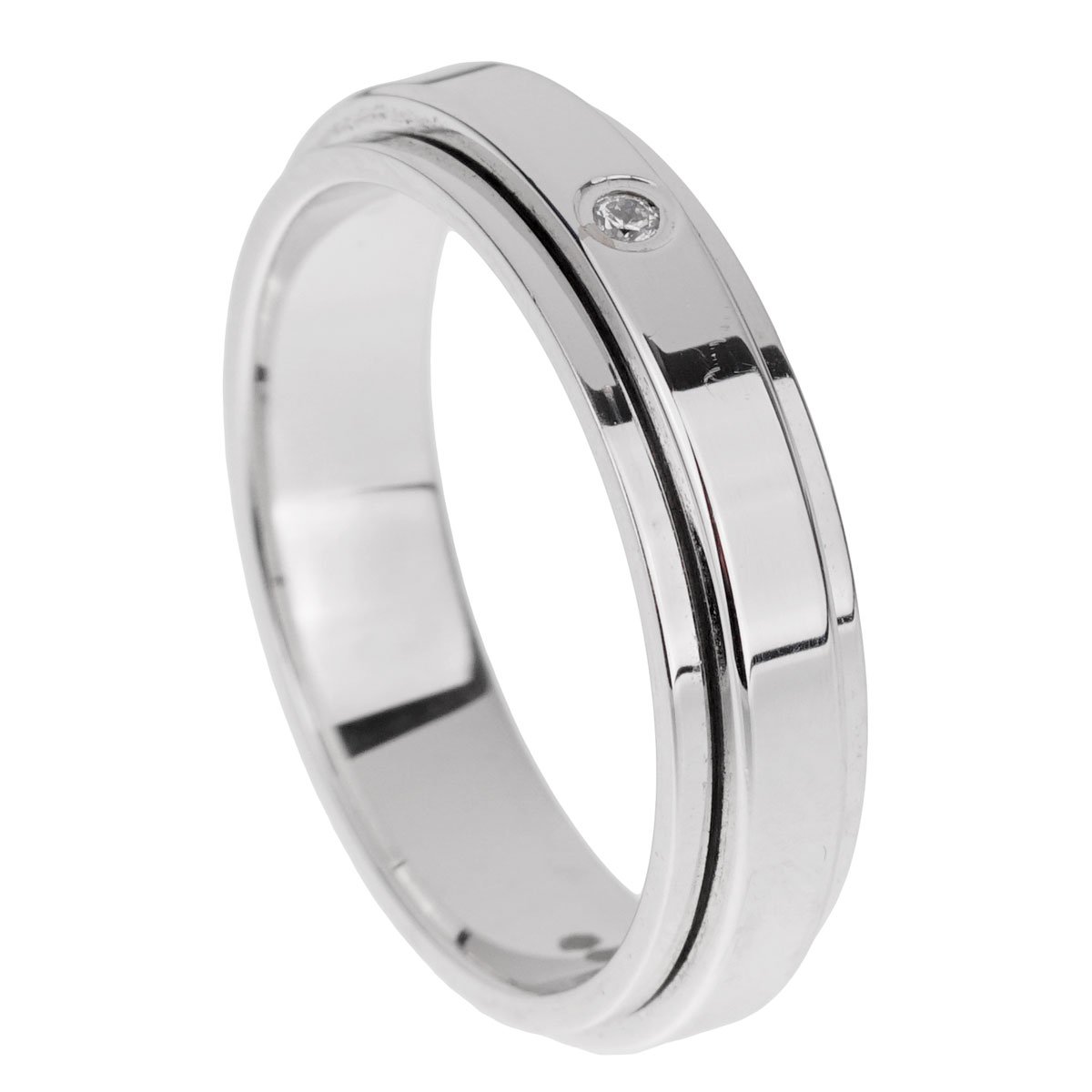 This particular variation is accented with a single brilliant cut diamond set into the rotating band. The diamond adds a discreet sparkle that elevates the overall design, striking the perfect balance between minimalism and sophistication. Its placement ensures that with every turn of the ring, a flicker of light dances across its surface, enhancing the experience of movement and giving the piece an alluring presence.
