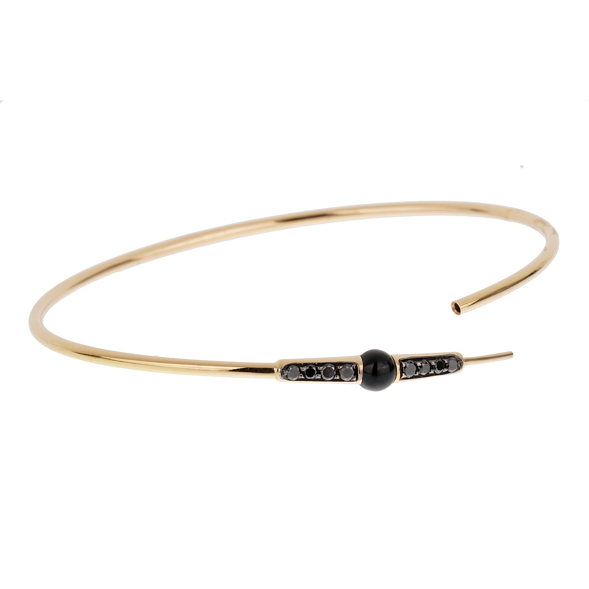 The contrast between the warm glow of rose gold, the deep luster of onyx, and the brilliant sparkle of the diamonds creates a composition that’s both modern and timeless. With its subtle open-ended silhouette, the bracelet is easy to slip on and stack, making it perfect for layering with other M’ama Non M’ama bangles or wearing as a minimalist solo piece.