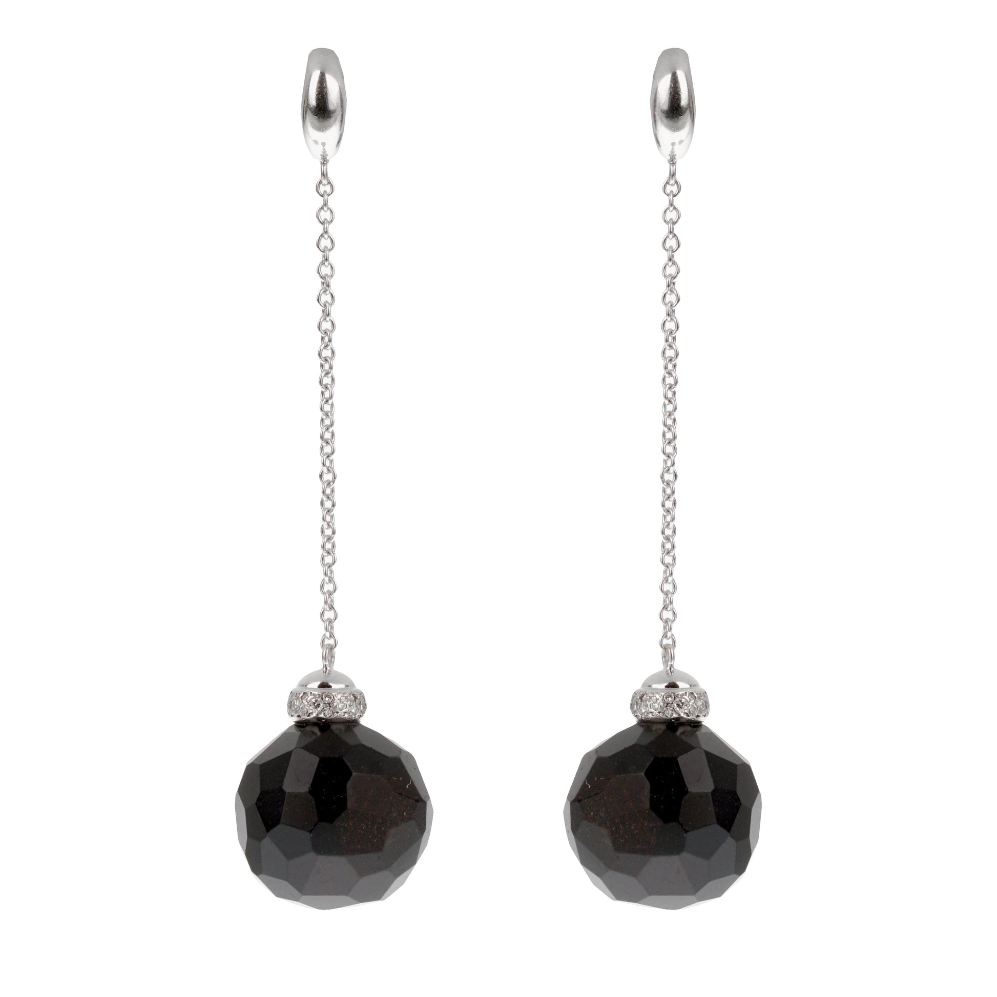 At the end of the chain, the focal point of these earrings is the magnificent faceted black onyx bead. This bold, spherical gem is expertly cut with numerous geometric facets that reflect light, creating a mesmerizing interplay of shadow and shine. The rich, deep black of the onyx offers a dramatic contrast to the bright white gold, exuding a sense of modern sophistication. The faceting on the onyx enhances its dimensionality, allowing it to catch the light from all angles, making it appear dynamic and vibrant despite its dark hue. Adding an extra layer of refinement, the onyx beads are capped with a band of round brilliant-cut diamonds, set in pavé-style settings.