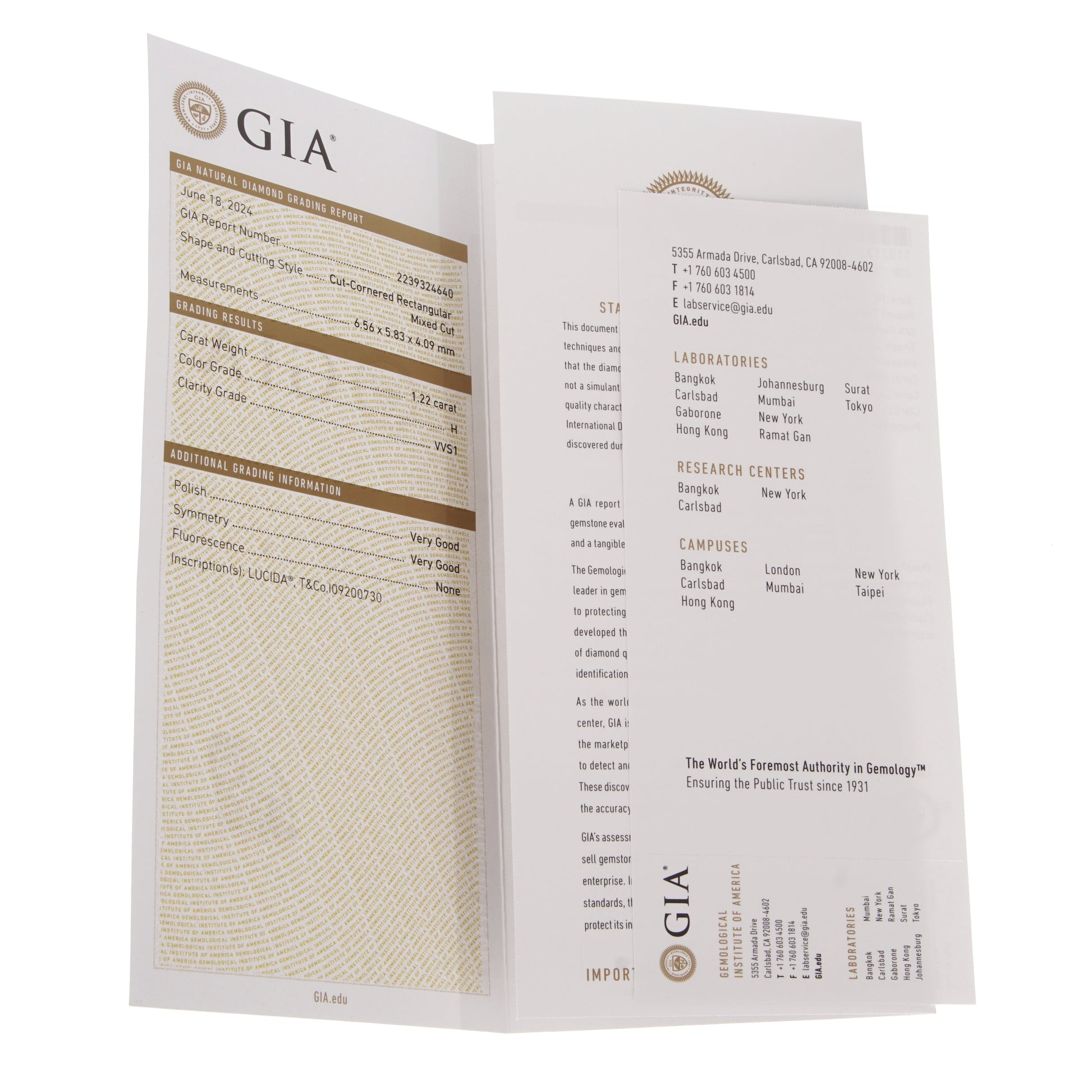 The center diamond, with a weight of 1.22 carats, is cut in Tiffany's exclusive Lucida style, combining the elegance of an emerald cut with the brilliance of a round cut. This unique cut showcases the diamond's exceptional clarity and fire, creating a mesmerizing display of light and sparkle. The diamond is graded H in color, ensuring a near-colorless appearance that complements the platinum setting perfectly. Its VVS1 clarity grade indicates that the diamond is virtually free of inclusions, making it an exceptional and rare gemstone.