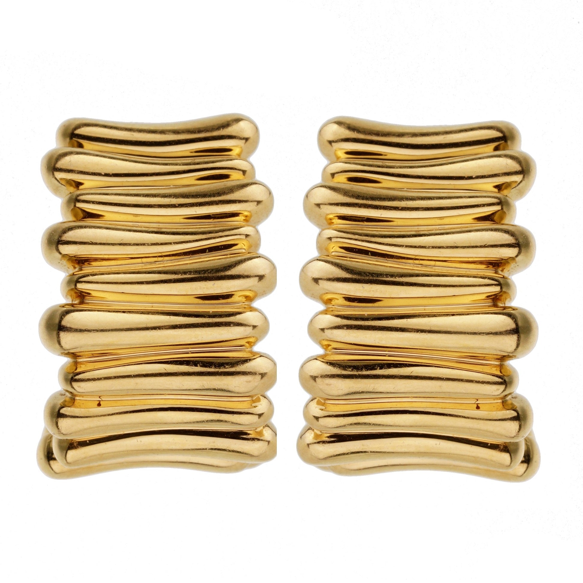 A chic set of Tiffany & Co earrings showcasing an overlapping yellow gold design. The earrings have a length of .78" and .55" wide.
