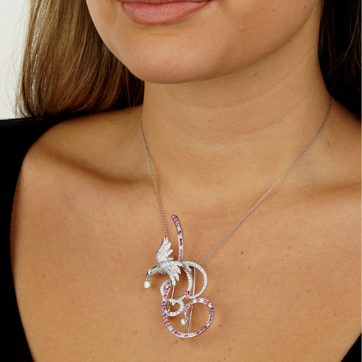 Meticulously crafted in luxurious 18k white gold, this exquisite Birds of Paradise design showcases a dazzling array of pink sapphires and sparkling diamonds, thoughtfully arranged to create a harmonious and vibrant display of color and light. The alluring pink sapphires, chosen for their exceptional quality and hue, form the delicate plumage of the bird, while the brilliant round-cut diamonds accentuate the intricate details and lend a sense of depth and dimension to the piece.