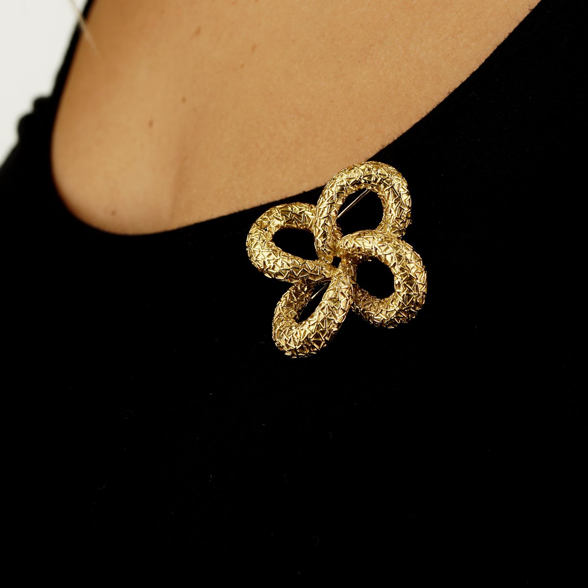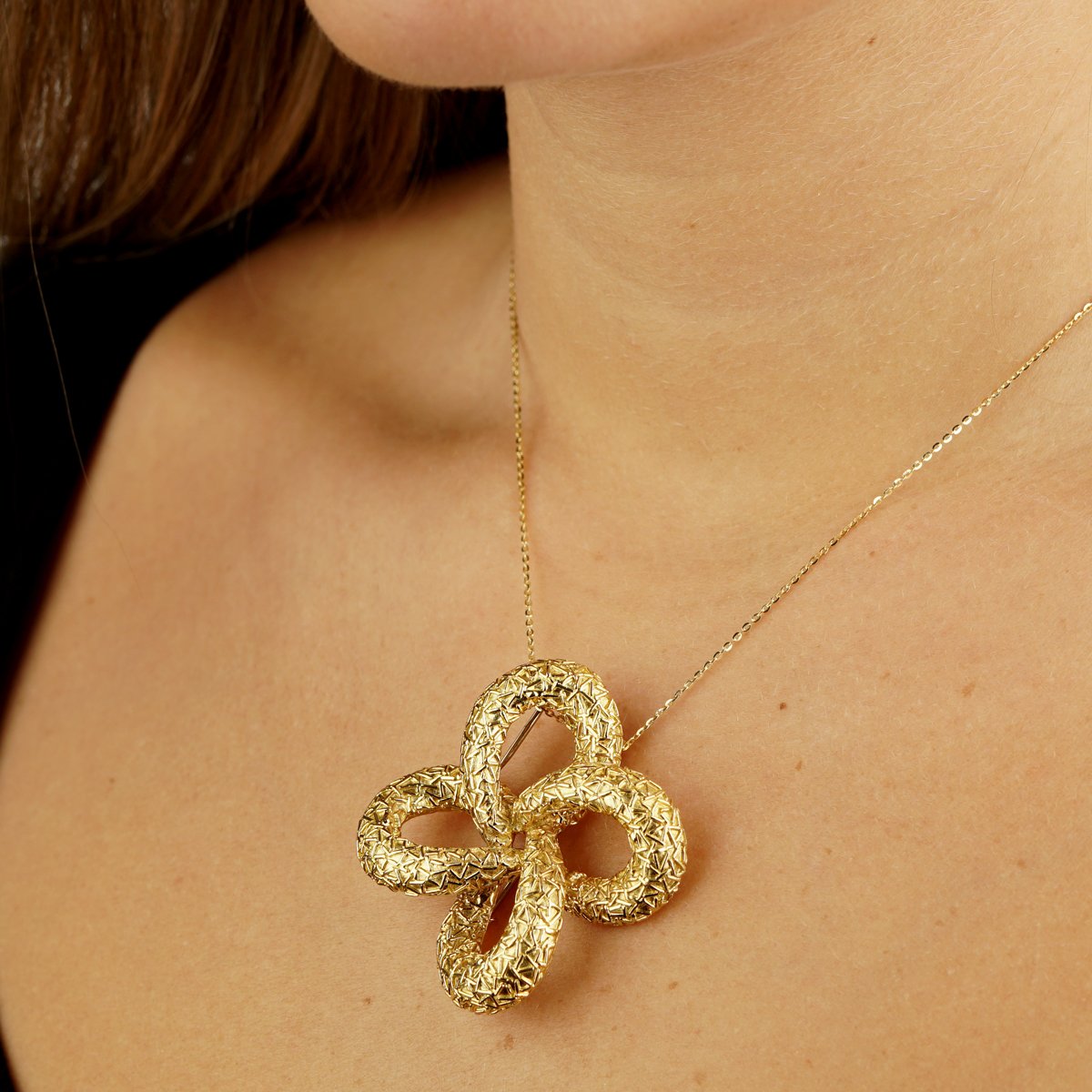 This classic, four leaf gold brooch pendant by Van Cleef & Arpels is finely crafted in 18k yellow gold. The four interlocking, open loops are slightly concave shaped and adorned with tiny gold geometric elements. 2" in length, it can be worn both as a brooch or as a pendant necklace.