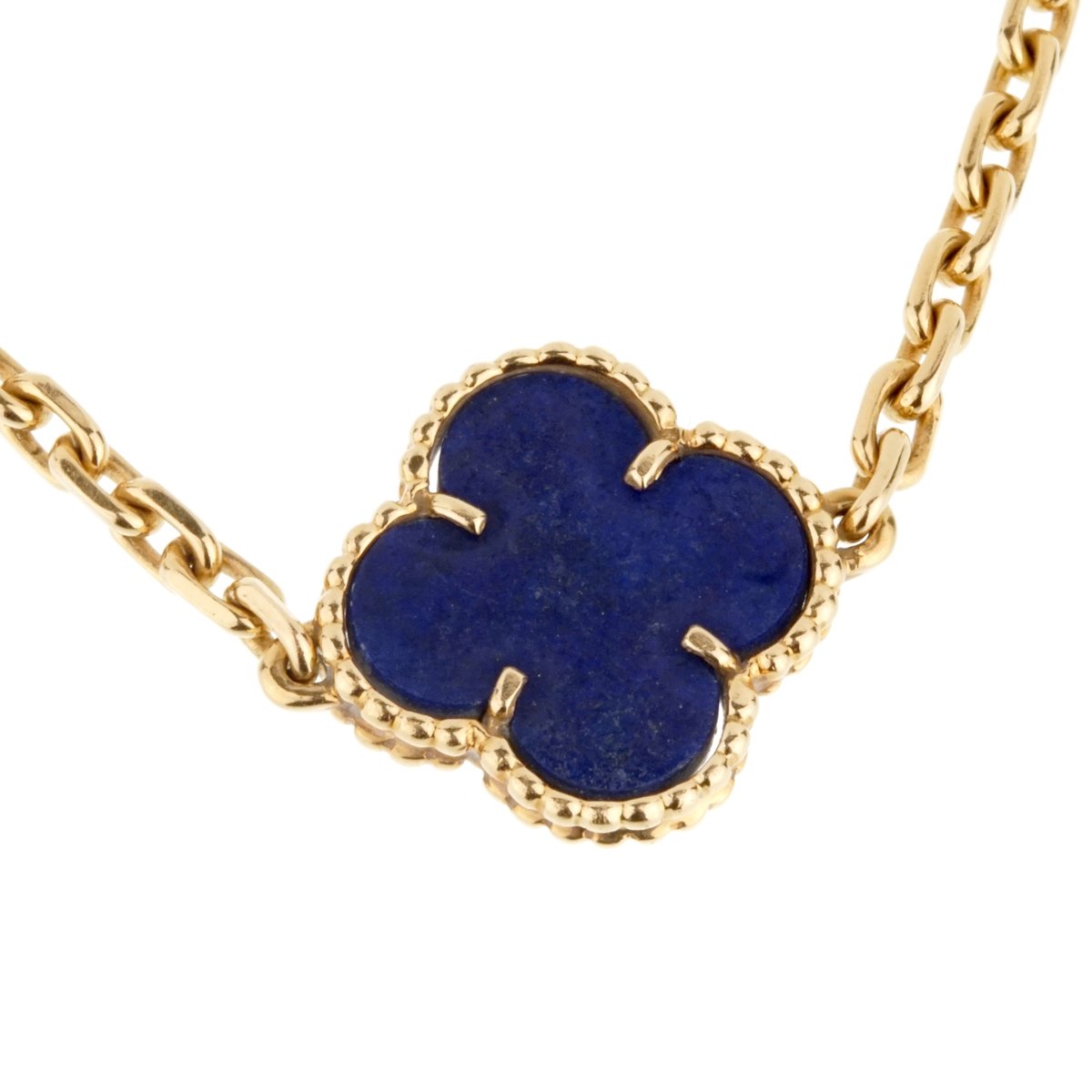An iconic Van Cleef & Arpels bracelet featuring 1 Vintage Alhambra motif set with a royal blue Lapis Lazuli stone in 18k yellow gold.