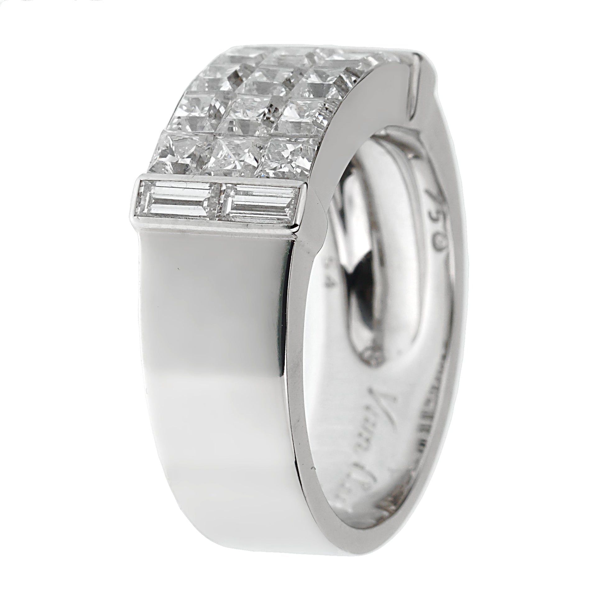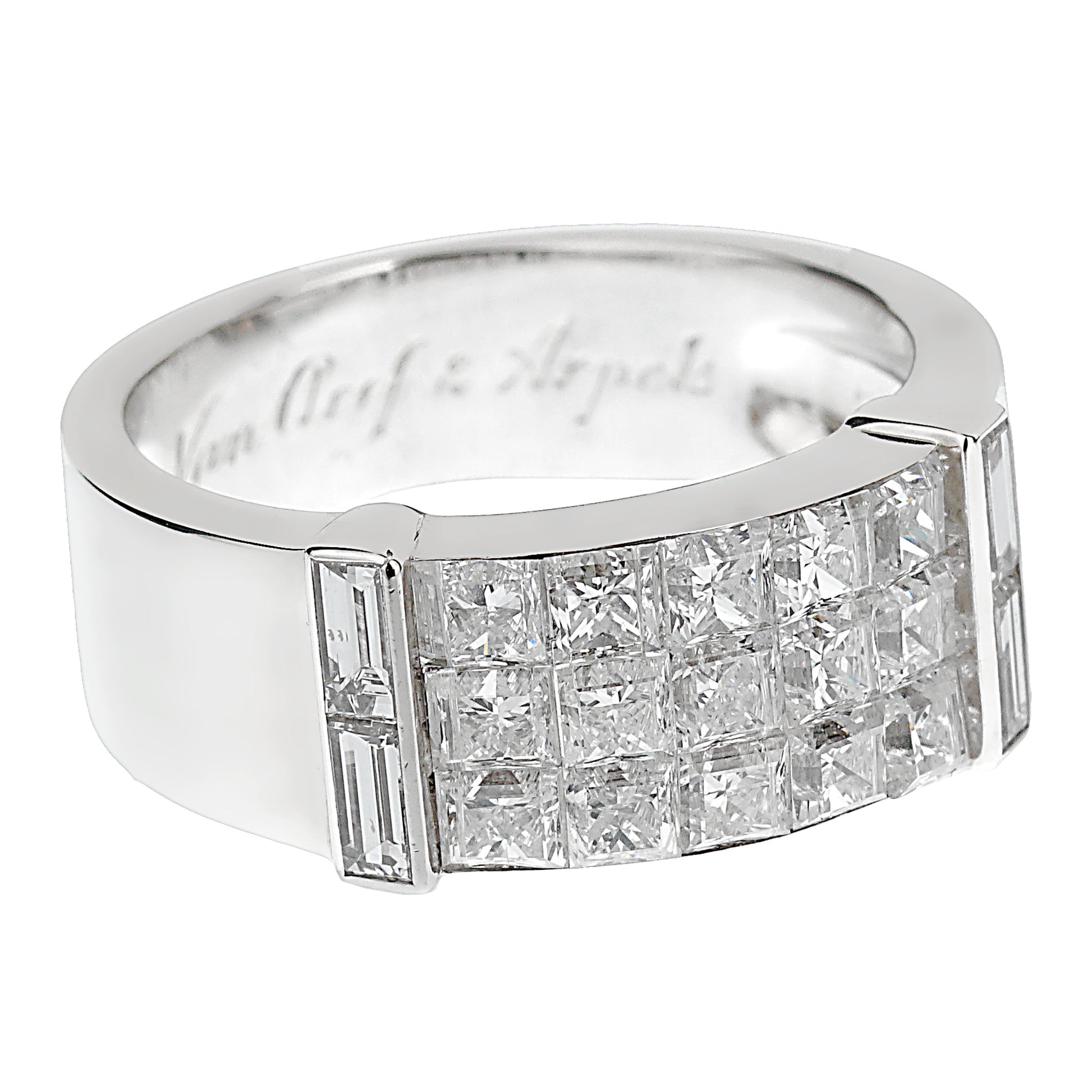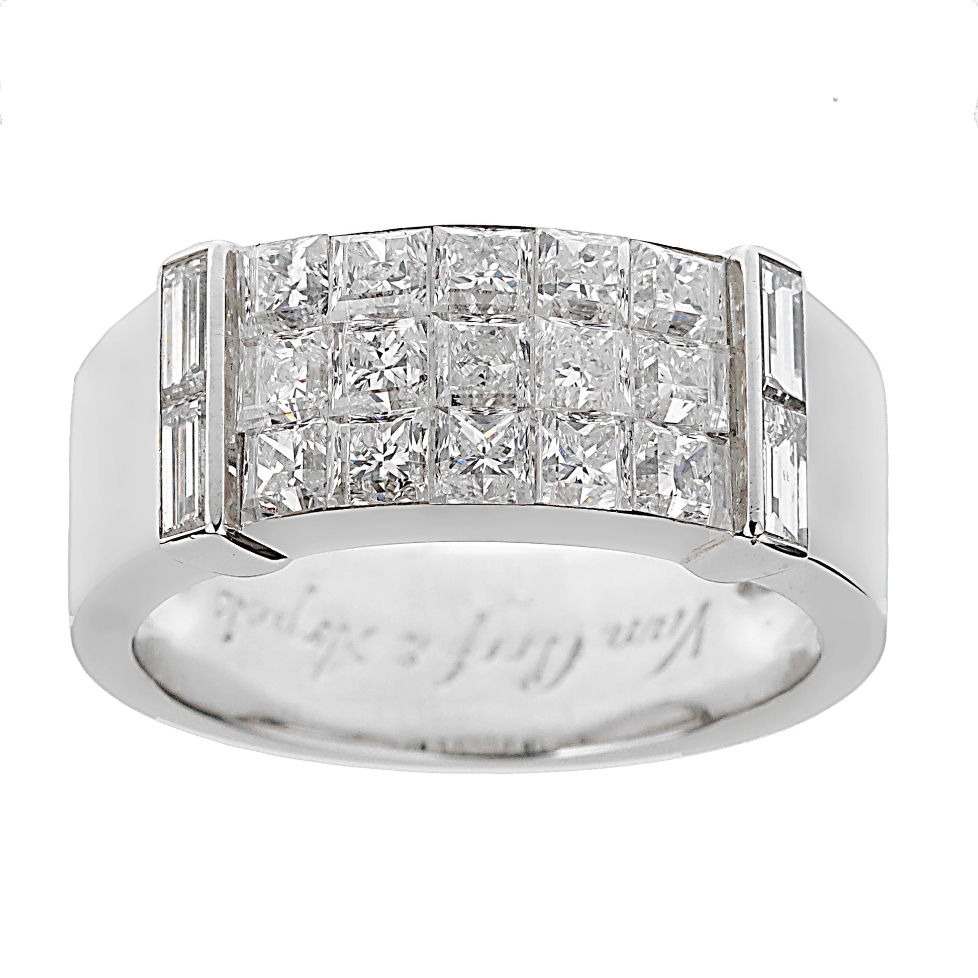 Exquisitely crafted in lavish 18k white gold, the ring boasts a trio of intricately set rows of shimmering princess cut diamonds. These stunning gemstones, renown for their geometric precision, enchant the eye, emanating brilliant fire and scintillation with every movement. The mystery in the "Mystery Setting" is the meticulous manner in which the diamonds are set, allowing no prongs to be seen, which imparts a surreal floating illusion to the diamonds.